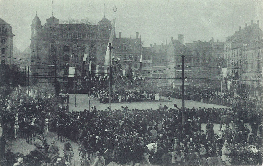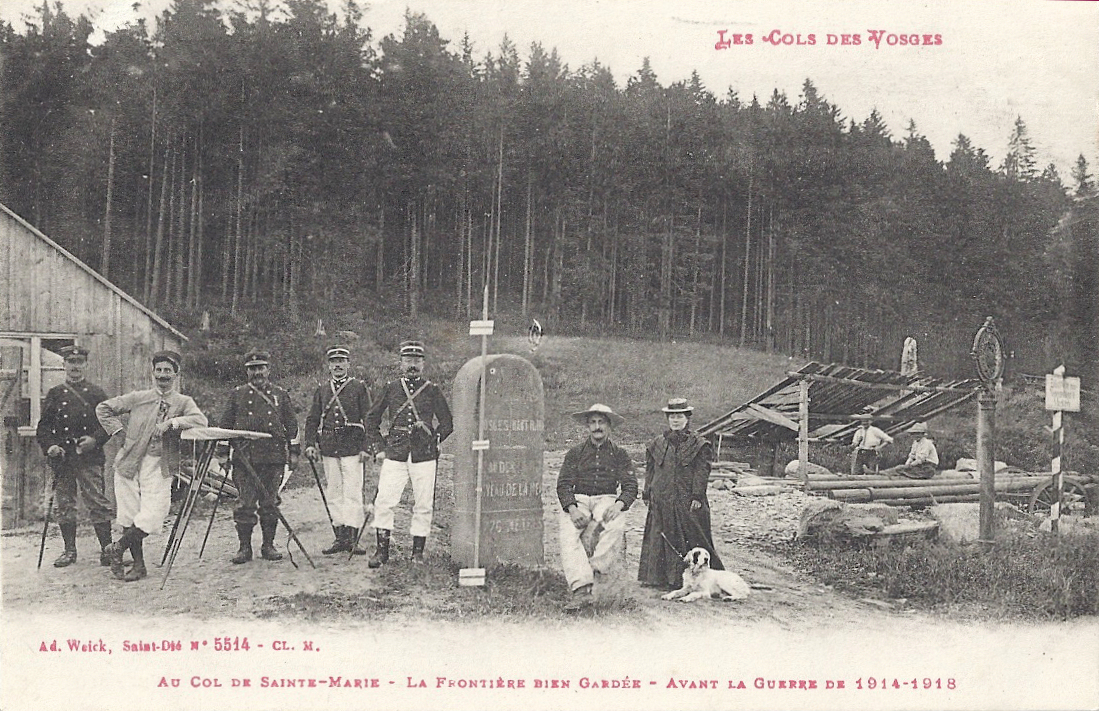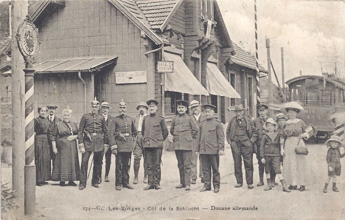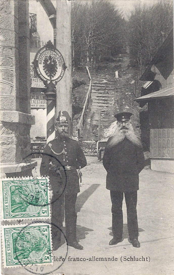 The officers in this postcard are in annexed Alsace , on German territory, standing by the frontier posts of Germany (the round plaque with the Imperial eagle) and France (the adjacent oblong plaque nearer the photographer).