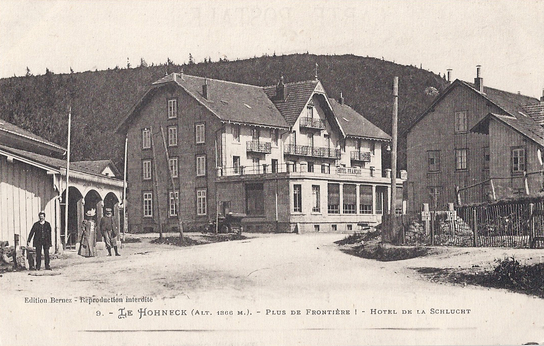 The Col de Bramont (956m) is north of the Col d’Oderen, east of the busy ski resort la Bresse and south of the popular Col de la Schlucht. It is one of the wilder of the frontier cols, and in the period when it was actively guarded, there was nothing at all there apart from a small wooden hut which provided shelter for customs officials. Consequently smuggling flourished in the area. Contemporary postcards reveal a muddy, poorly-formed road, surrounded by ferns and forest. It looks inaccessible and still is fairly difficult in places : the D-road from Wildenstein climbs a series of steep, challenging hairpin bends.