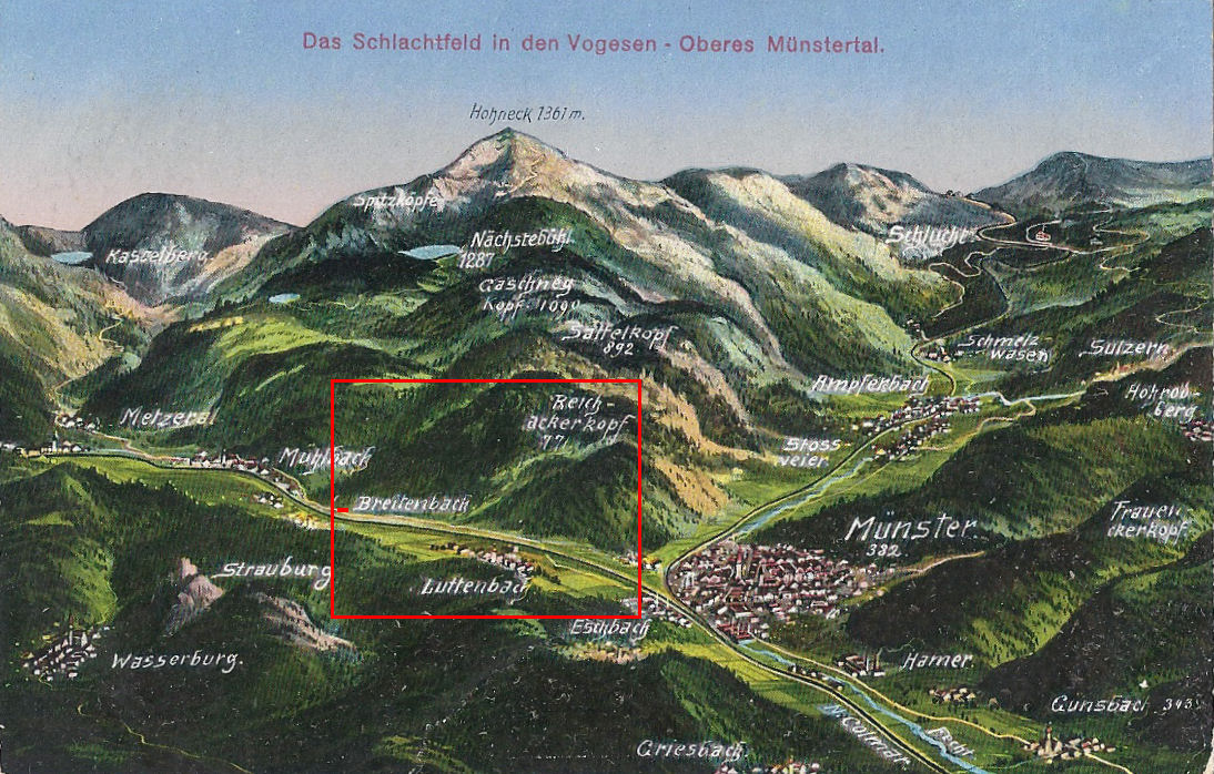 Metzeral is 6.5 km west of Munster, in the valley of the river Fecht. Control of the valley was important for both sides and military operations took place there early in 1915, coinciding with the intense fighting at Hartmannswillerkopf. The battle for Metzeral in June 1915 tends to be overshadowed by the bitter struggle for Hartmannswillerkopf and (beginning just one month later) the fierce battle at le Linge, but it was important and deadly.