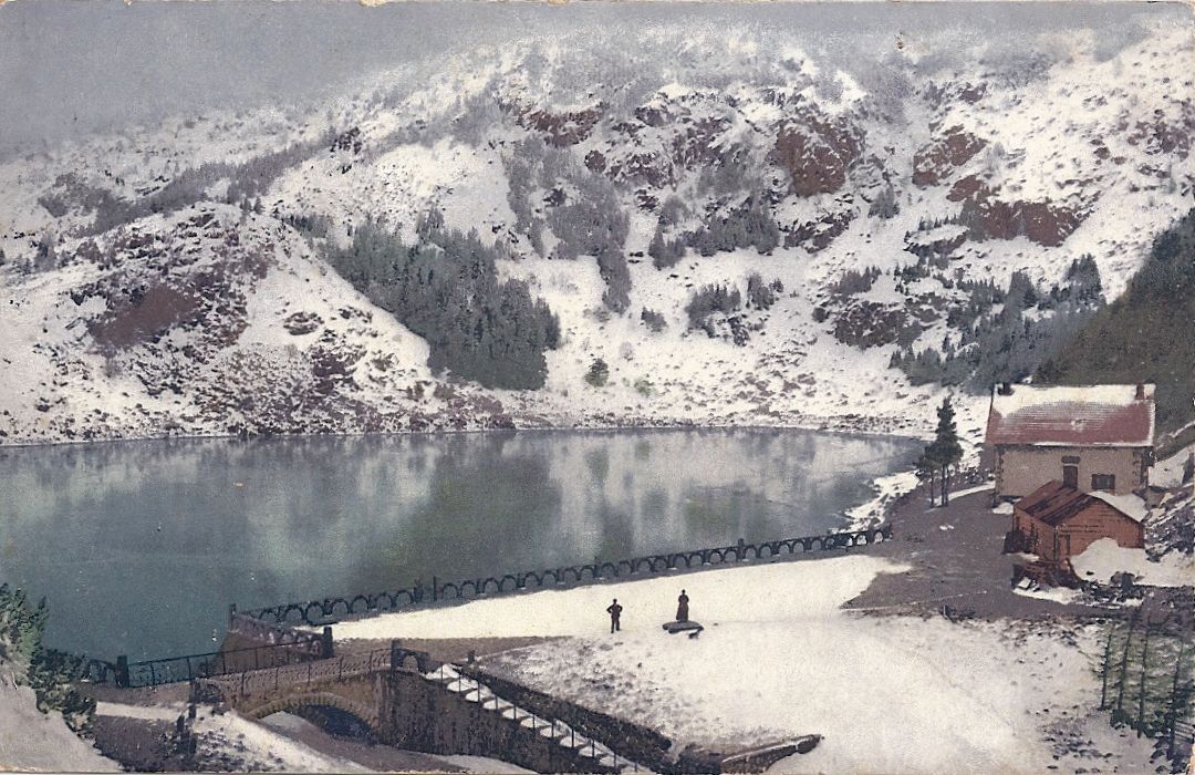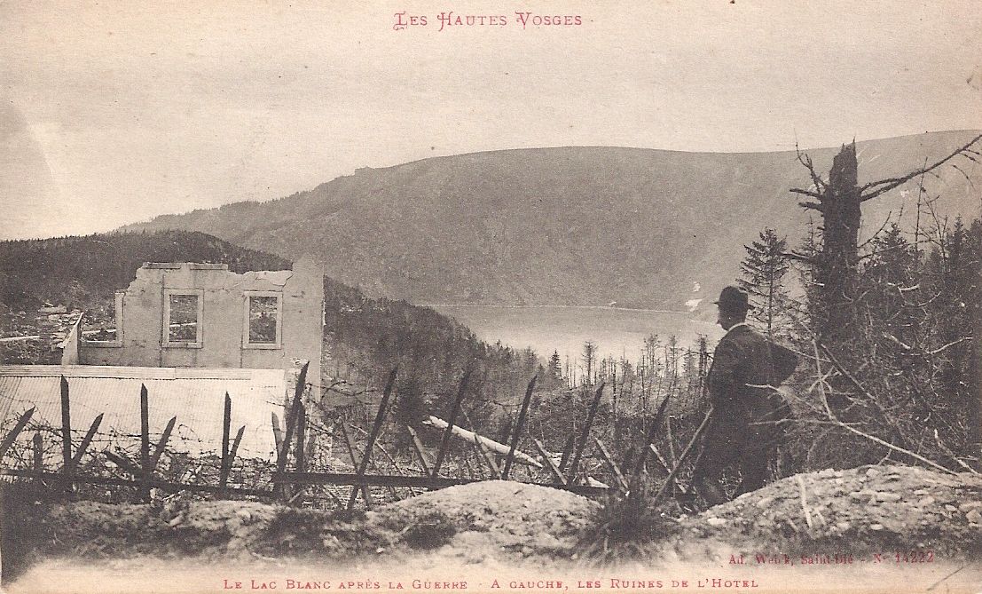 The 1914 mountain battleground of la Tête des Faux overlooks Lac Blanc and towards the villages of Orbey and Lapoutroie. Lac Blanc after the Great War, the hotel in ruins: