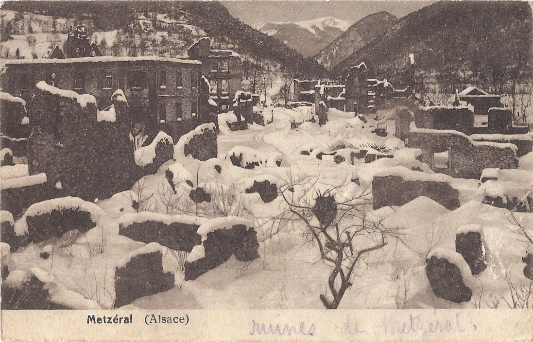 The populations of the villages or Metzeral and Sondernach were evacuated on June 9th and the attack began on June 15th. The main action took place on 20th and 21st June, with heavy fighting street by street, building by building, hand against hand, bayonet against bayonet. The village was ruined beyond recognition, the tranquil river valley destroyed. By the 24th June, the French had secured Metzeral but the human cost was devastating. The French cemeteries of Chêne Millet and Sondernach, the German cemetery of Breitenbach, are witness to the losses in the valley of the Fecht.