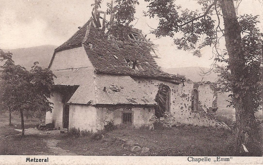 L’église de l’Emm takes its name from Emma, niece of Charlemagne, who founded a hermitage on this colline near Metzeral in memory of her fiancé, Roland de Roncevaux, in the fifteenth century. Through the next five centuries, the original chapel was variously destroyed, rebuilt, rededicated, refounded and eventually wrecked in the Battle of Metzeral (15th – 21st June, 1915).