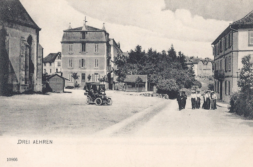 The town before the Great War while under German occupation, labelled with its German name Drei Ähren. There is now a  rather special German military cemetery in the town. Its headstones have been replaced with modern crosses and wild flowers dominate the grounds.