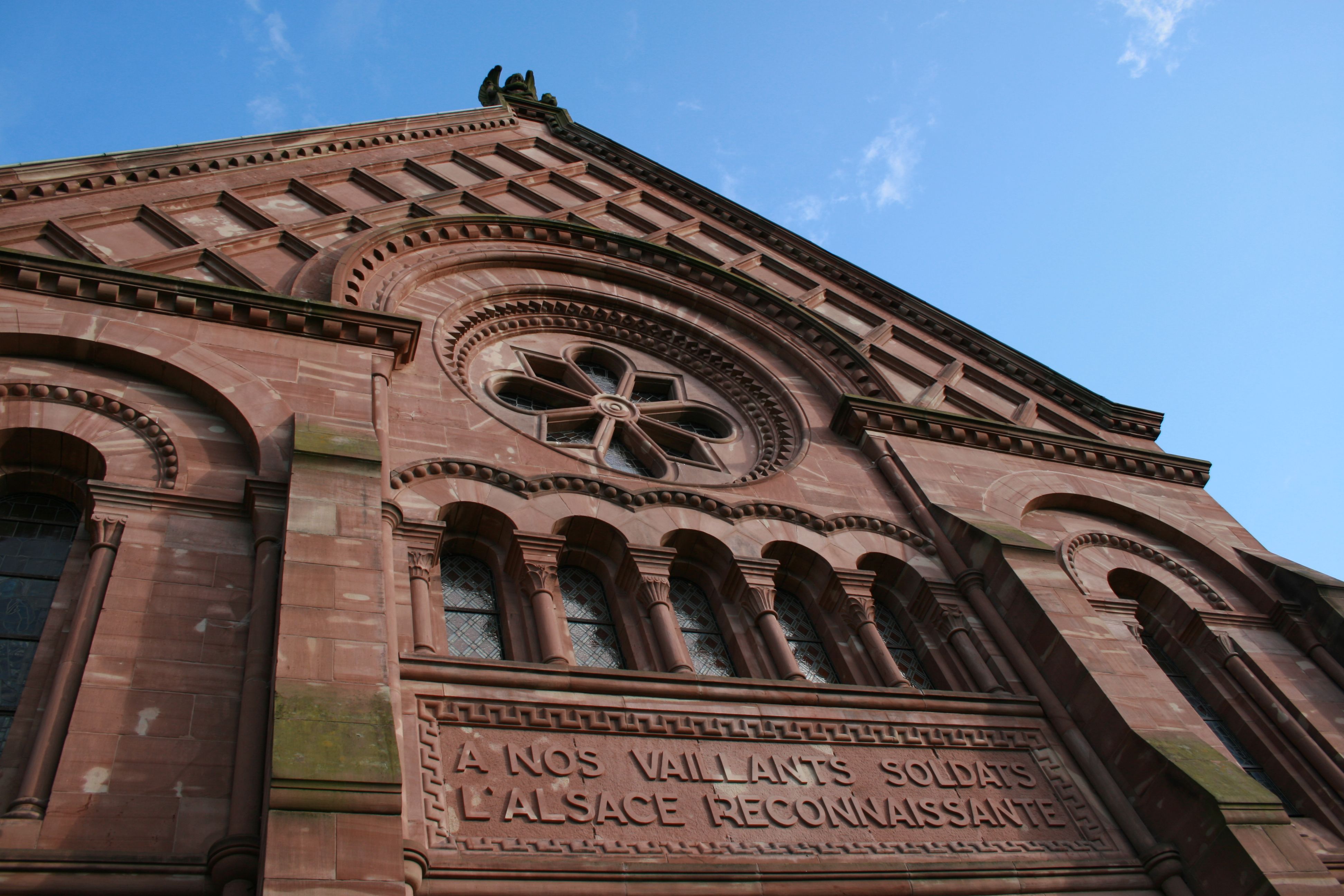 The project was overseen by a committee under the banner Souvenir Alsacien, which included the bishop of Strasbourg and General Pouydraguin. Fundraising took place across France and abroad. The builders used local red sandstone (the same as was used for the cathedral in Strasbourg) and prominent on the façade is the inscription expressing the gratitude of Alsace: “À nos vaillants soldats, l’Alsace reconnaissante”.