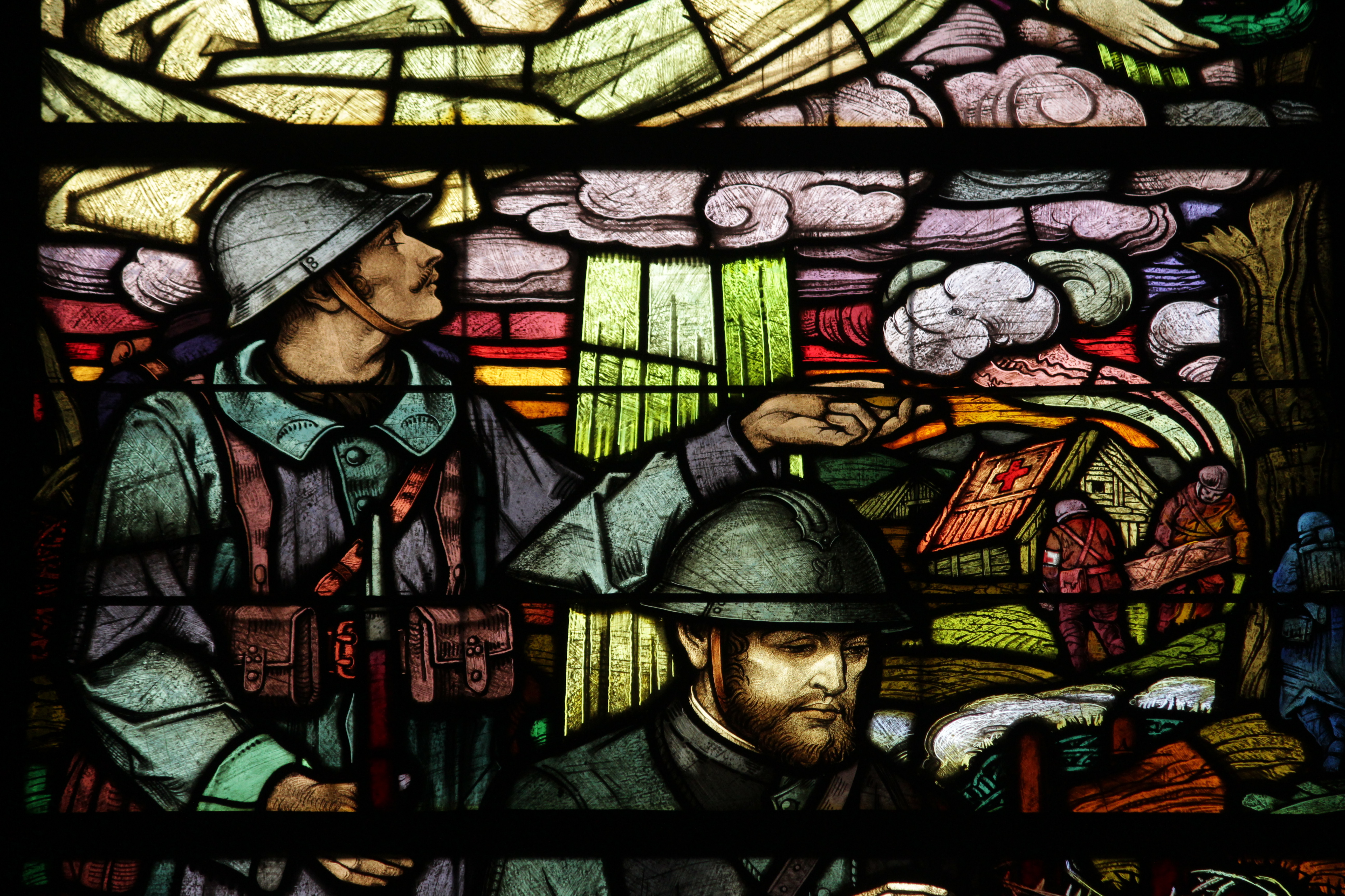 Inside, the walls are lined with 1.80m high marble panels, each engraved with the names of the soldiers who died in the battle for Metzeral. Stained glass windows throw their saturated light on to the light marble. It is a profoundly peaceful place which encourages reflection. One window depicts a chaplain ministering to a dying comrade among the debris and flashing lights of the battlefield. It is called, simply, ‘Nos morts’.