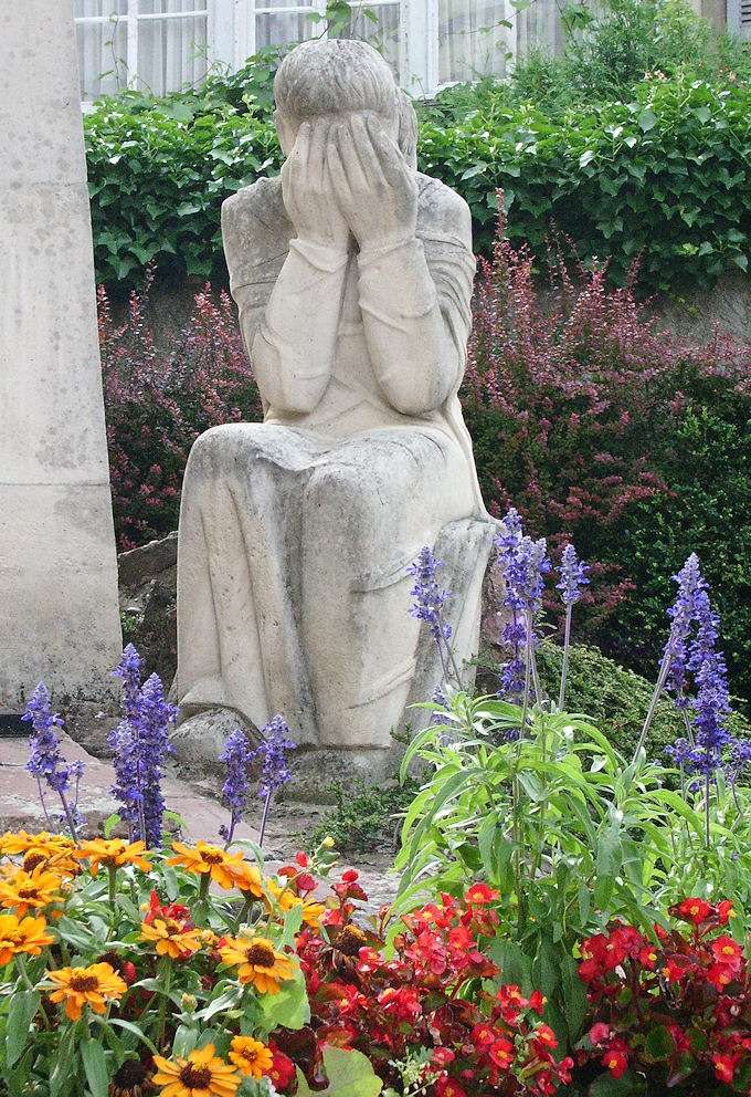 It is a memorial of unexpected height and power; the loyal Chasseur figures, bravely ready for any challenger and cared for in death by a despairing figure of Mary, demand attention. Jeanne’s immense elevation, her raised cruciform sword and her striking gold armour communicate as a symbol of defiance and inner strength. Your eye is drawn upwards from the brave soldiers to their alleged inspiration as they fought to regain Alsace and Moselle for France.